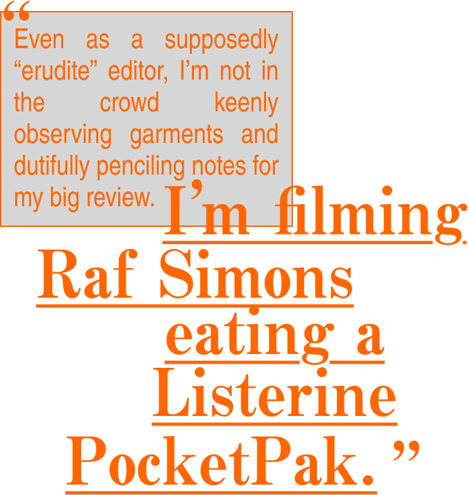 The fashion show in particular is now the content gladiator arena of our time. Yes, the “main” event is models walking on a runway in new clothes. But that has become increasingly secondary to the dynamism around the show. The things we all experience and engage with are the teaser campaigns, the internationally syndicated GRWMs, the front row influencer antics, the lookbooks shot on location, the street style photography outside, the behind-the-scenes photography inside, whatever clues the designer is leaking on their Instagram, and the incessant shit-posting of every single iPhone-wielding human in the room bearing witness. Even as a supposedly “erudite” editor, I’m not in the crowd keenly observing garments and dutifully penciling notes for my big review. I’m filming Raf Simons eating a Listerine PocketPak. I’m catching slo-mos of the key looks for our Tik Tok. I’m even checking social media to see what my peers are already posting (live, before the show is even over) from the front row.