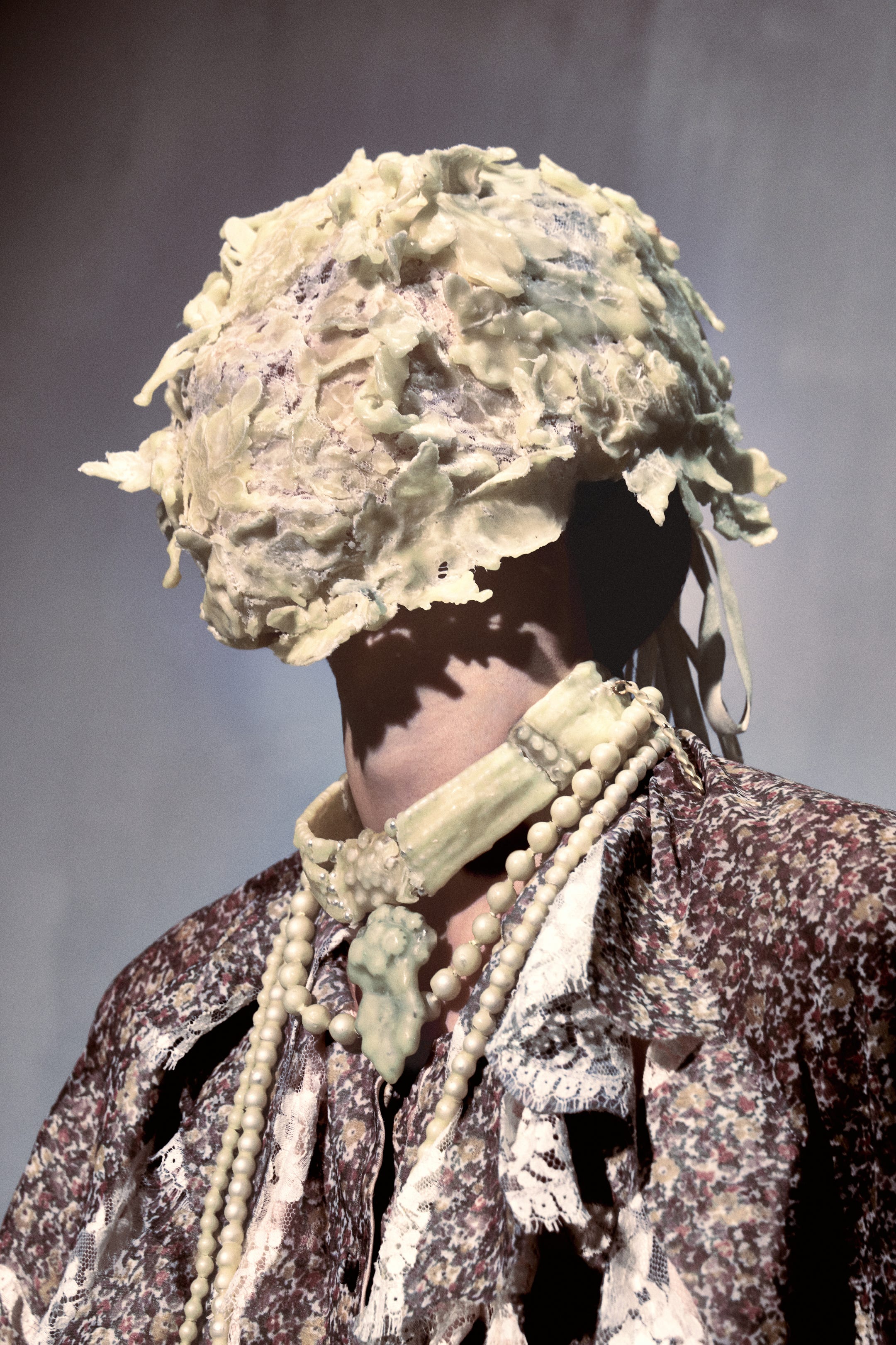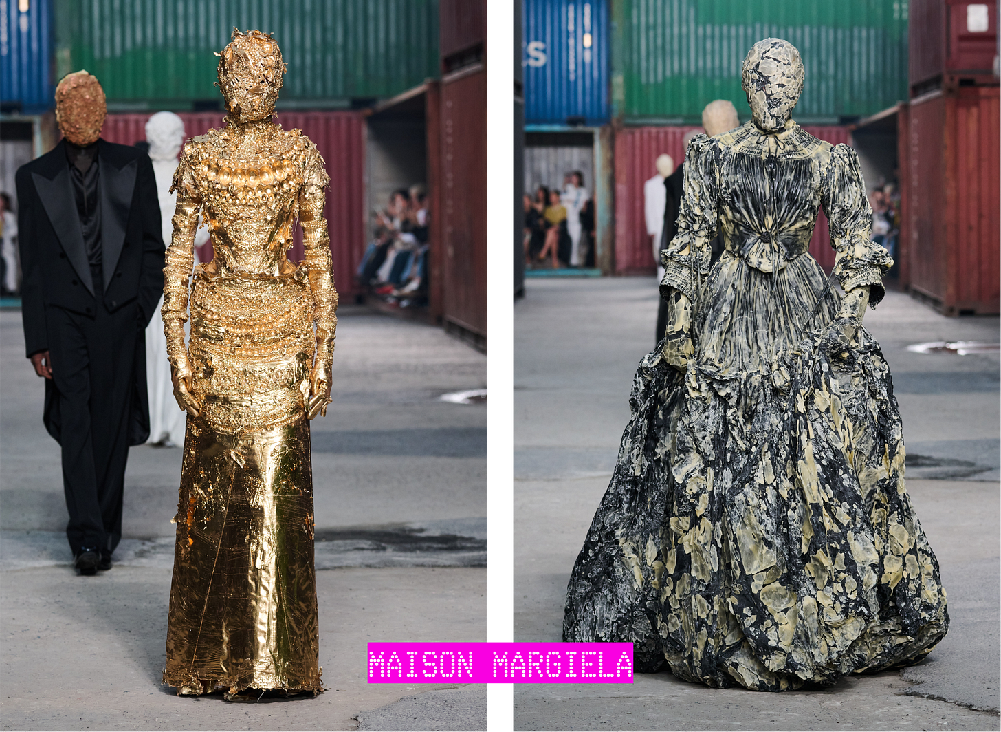 I would be hard-pressed to not say the porcelain dress. When the model was walking, there was almost an anxiety in the air, which really called upon the first season of the Artisanal collection that Martens showed last year. I think that all the masks were incredible. The first ones that had those doll faces printed on them were so haunting. Also, the beeswax dresses—the one that looked like denim that had beeswax poured all over it. How insane was that?