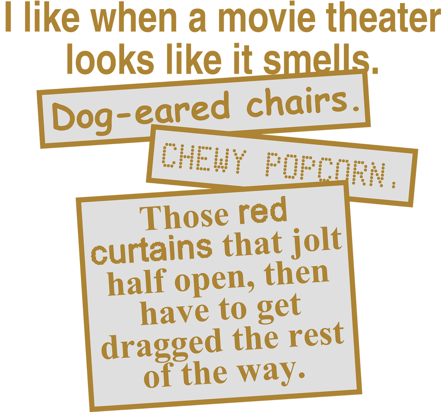 Shittiness is charming to me. Luxury is not. My idea of movie watching hell is one of those cinemas that takes your food order at your seat, and offers pouffy cushions for your feet.