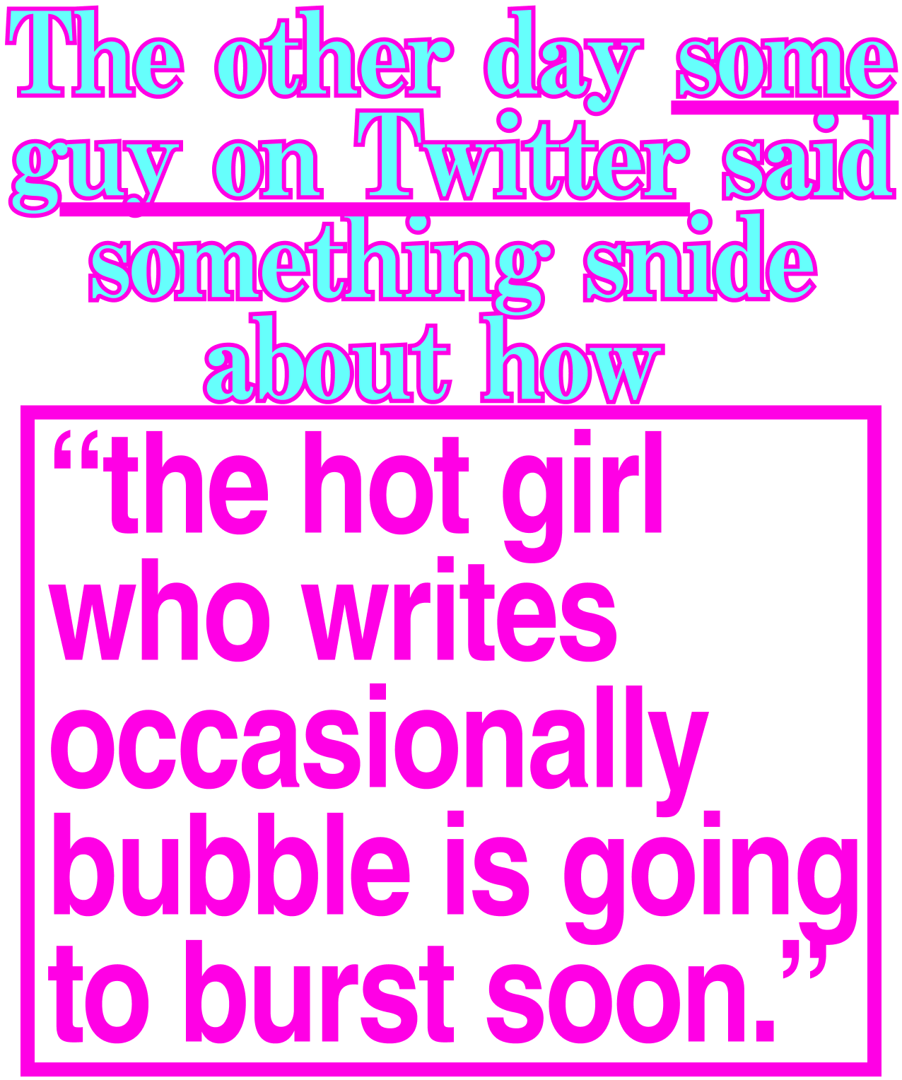 Every now and again the overwrought brodernist idea makes its way from the manosphere into my own little life, to which I say finally: Whatever!!!! The hot girl who writes occasionally is the backbone of the internet! Remove her and all you have left are gooners, sex bots, ASMRtists, and movies broken into 30-minute long TikToks that have robot voiceovers. Besides, if you feel a throb at the temples forcing you to read Charli xcx’s new substack entry, consider that the gun is attached to your own hand.