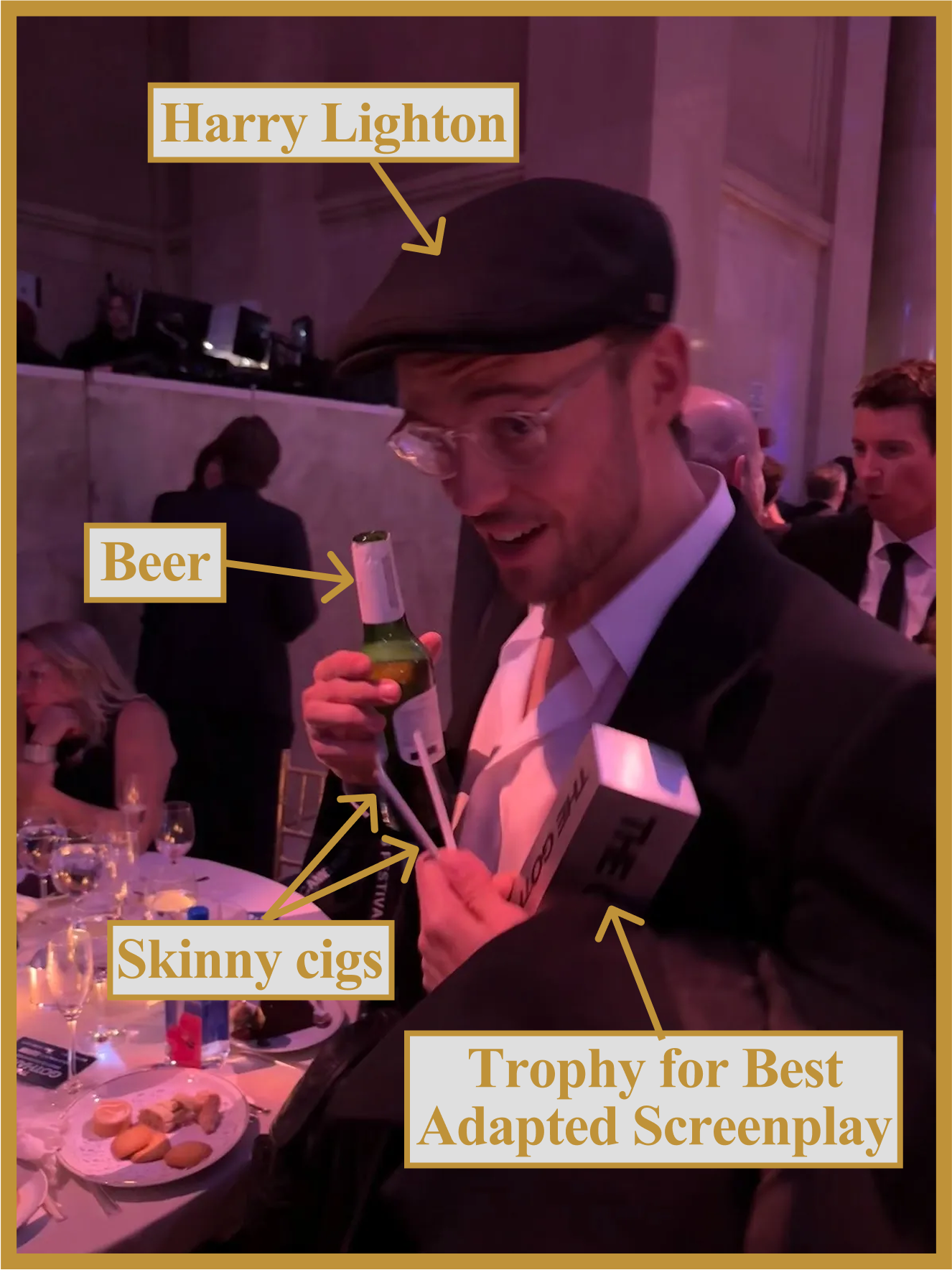 They were all in the room. Rocky brought Rihanna. I ran into Elle Fanning and Paul Thomas Anderson and saw Indya Moore sat at their table texting. After the ceremony, I caught Pillion director Harry Lighton on the way out. He was carrying a beer, two skinny cigs, and his trophy for Best Adapted Screenplay. Hot!