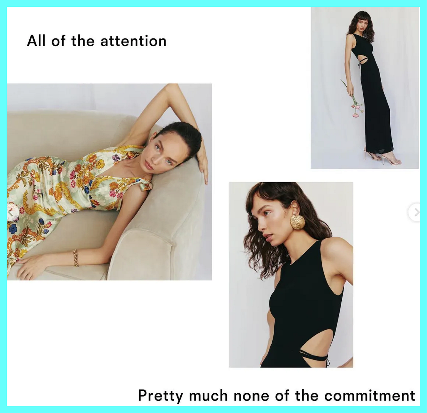I’ve always been interested in the brand Reformation. Founded in 2009 by Yael Aflalo, the initially mission-driven brand (deadstock fabrics only!) has become a one-stop shop for wedding guest dresses, office appropriate slacks, and “this is technically a dress” summer frocks. Despite past allegations of both racism and greenwashing, Reformation pulled in around $315 billion dollars in revenue in 2025. More revealing than its revenue is how they’re making it: Through the use of clever, simple, clickbaity copy. The brand’s name, a general nod to institutional reform, also references one of the most significant theological movements in Western history. Its newsletter and commercial content features sleepy photos of faux-Jane Birkins with text that feels ripped from Fleabag. The day-one tagline: “Being naked is the #1 most sustainable option. We’re #2.” What’s most perplexing about such provocative language is how nothingburger the clothes are.