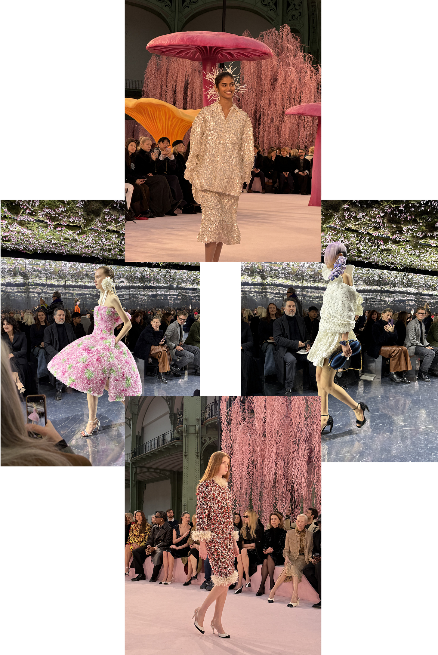At Chanel, Blazy had something to prove, and he knew it. The prevailing skepticism was that his hand might be too heavy, his instincts too sculptural, his sensibility too grounded for the lightness Chanel demands. He answered that critique not with force, but with restraint. The Grand Palais was transformed into a gentle reverie, with plush pink carpets and towering mushrooms scattered throughout the space like something out of a dream you don’t want to psychoanalyze too deeply. The mushroom pendant invitation made perfect sense once inside. The room was packed with familiar faces, including Dua Lipa, A$AP Rocky, and Nicole Kidman, but the atmosphere felt unusually calm, expectant.