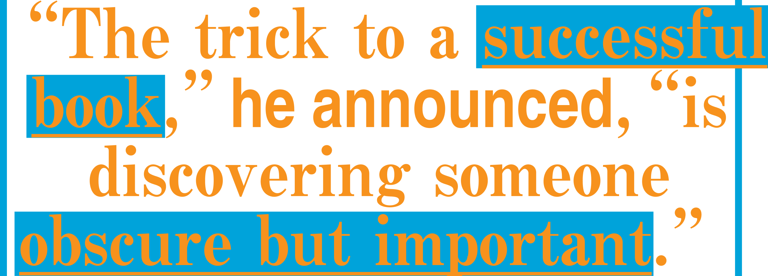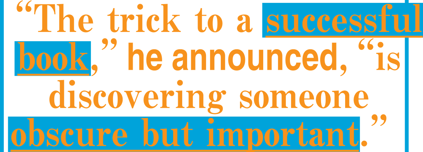“The trick to a successful book,” he announced, “is discovering someone obscure but important.”