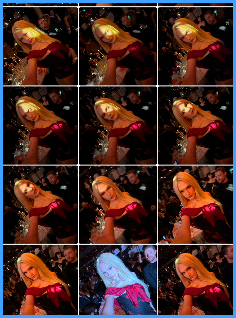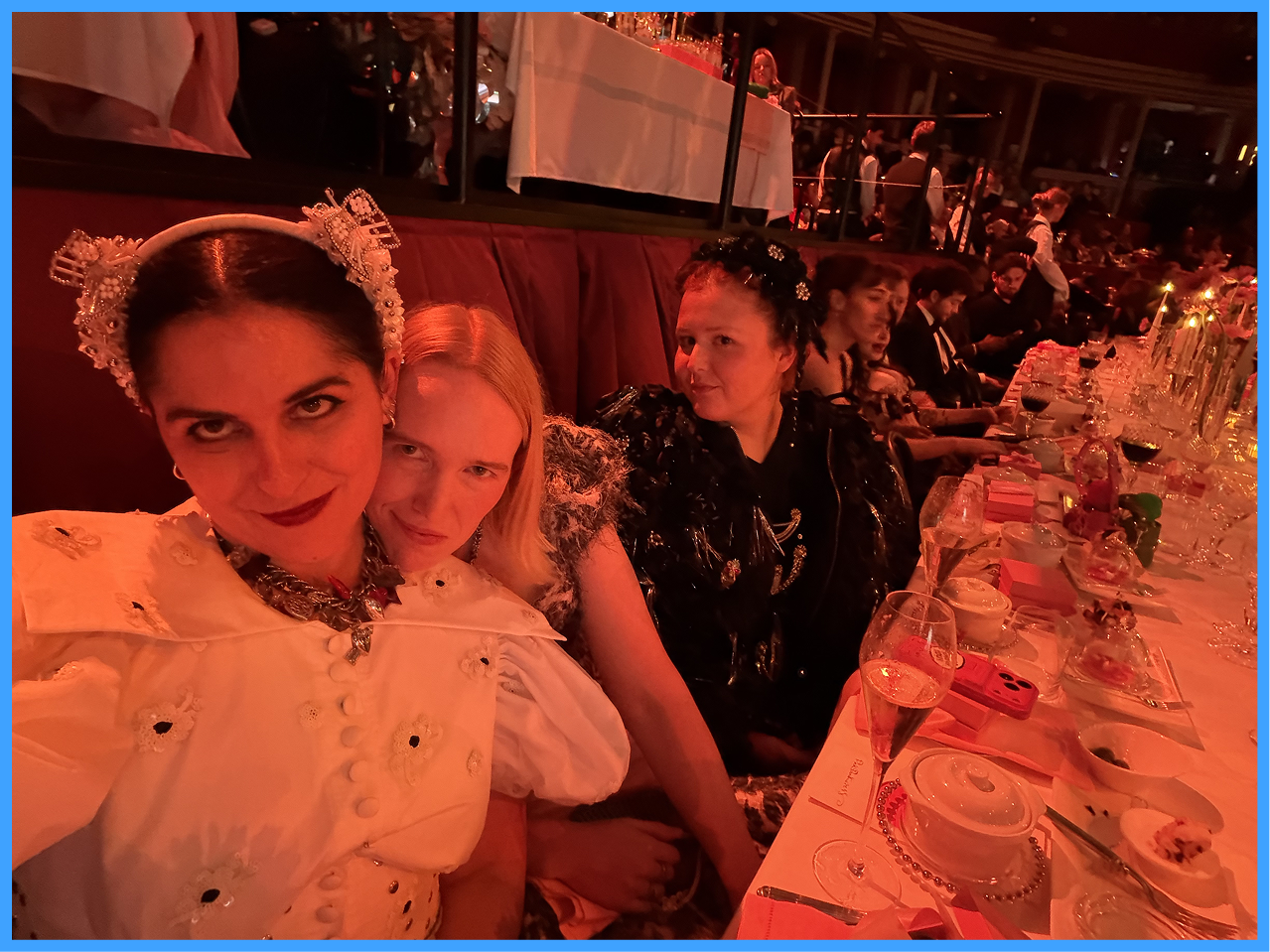 9:01: There’s a long saxophone solo in the middle of Raye’s performance. It’s fascinating to see fashion’s cliques so out in the open. At the DSM table, Ronnie Cooke Newhouse (married to Condé Nast owner Jonathan Newhouse), Raf Pavarotti, Al McKimm (formerly of i-D), Simone, Gwendoline, Craig. The Givenchy table is fancy with Rooney Mara and Blanchett. Edward Enninful has all the celebrities: Mick, Sienna, Rita, Taika, Charlotte Tilbury. The McQueen table is the cutest: Beabadoobee, Celeste, Alex Consani, a man with glasses I assume is a famous director. Alex takes my phone and takes selfies in her McQueen scarf dress and then turns around to show me her butt. “It’s a bumster!” she cheers before glancing sadly at her crack and saying “it could be lower.” I love her.