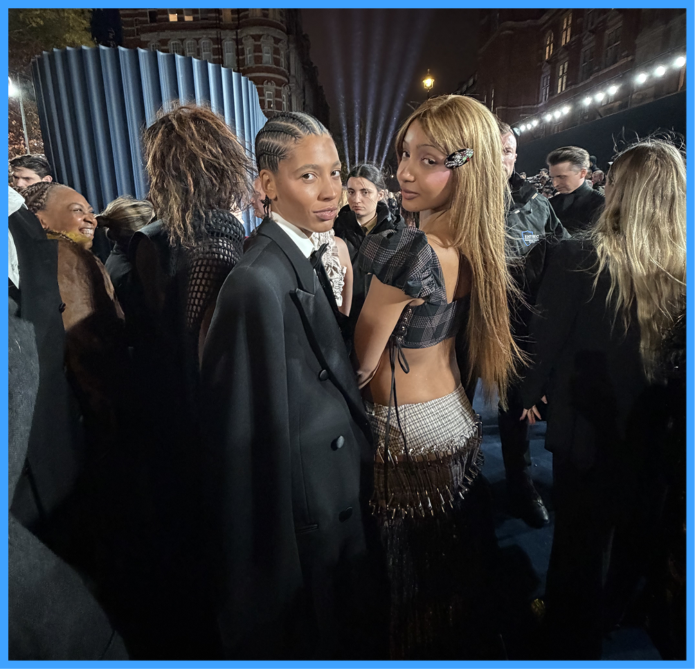 7:38: PinkPantheress and Kai Isiah Jamal arrive. Kai looks fabulous in a tuxedo—“I wanted something simple!”—and Pink is wearing a Chopova Lowena bra and skirt, looking like the apex pop girl. She is freezing and her PR is trying to push us to the front. This is where things go haywire. We tell the PR guards that Pink is a celebrity and Emma and Laura are nominees for Womenswear Designer of the Year and the very smug man says “there are a lot of nominees” and turns away. (There aren’t.)