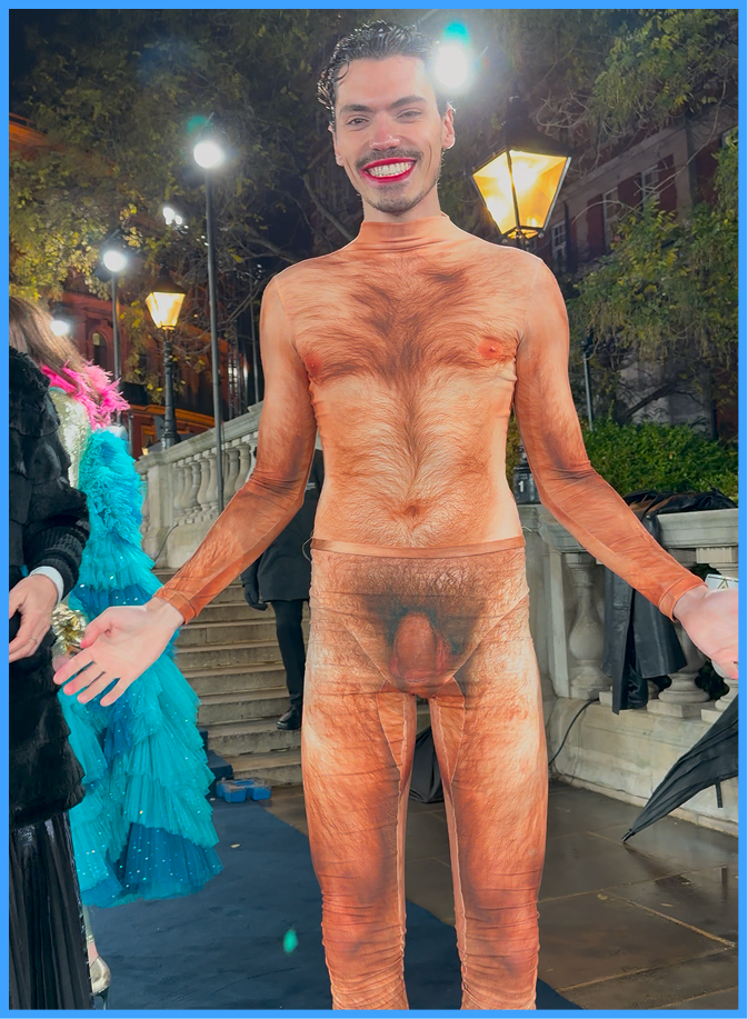 7:48: I give up and head for the auditorium. It’s just too cold to be standing in the rain, my hands are like ice. I run into Lyas on the steps (also freezing, also looking for his date). He’s wearing the JPG dick suit (no shrinkage!) and tells me his favorite British fashion person “has to be McQueen!” Tomorrow, at the crack of dawn, he’ll fly to NYC for the Chanel show and a La Watch Party he’s hosting. (A problem I don’t have because I am not invited to Chanel and when a stuffy British editor later tells me how “genius” it is that the show will be held on the subway and I laugh and tell them that’s so lame, like having a show on a London red bus. He seems disappointed in my ability to understand that to the upper 1% and their hangers-on, public transit is just so cute and cheeky. My opinion is that the 1%, and luxury conglomerates, should pay higher taxes so the subways they hold their fashion shows in can be more affordable to the citizens of the cities. But I digress!)