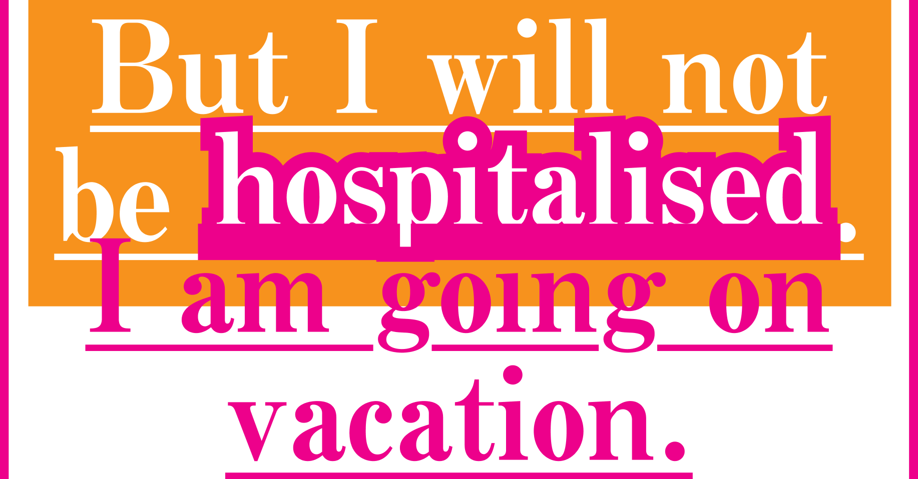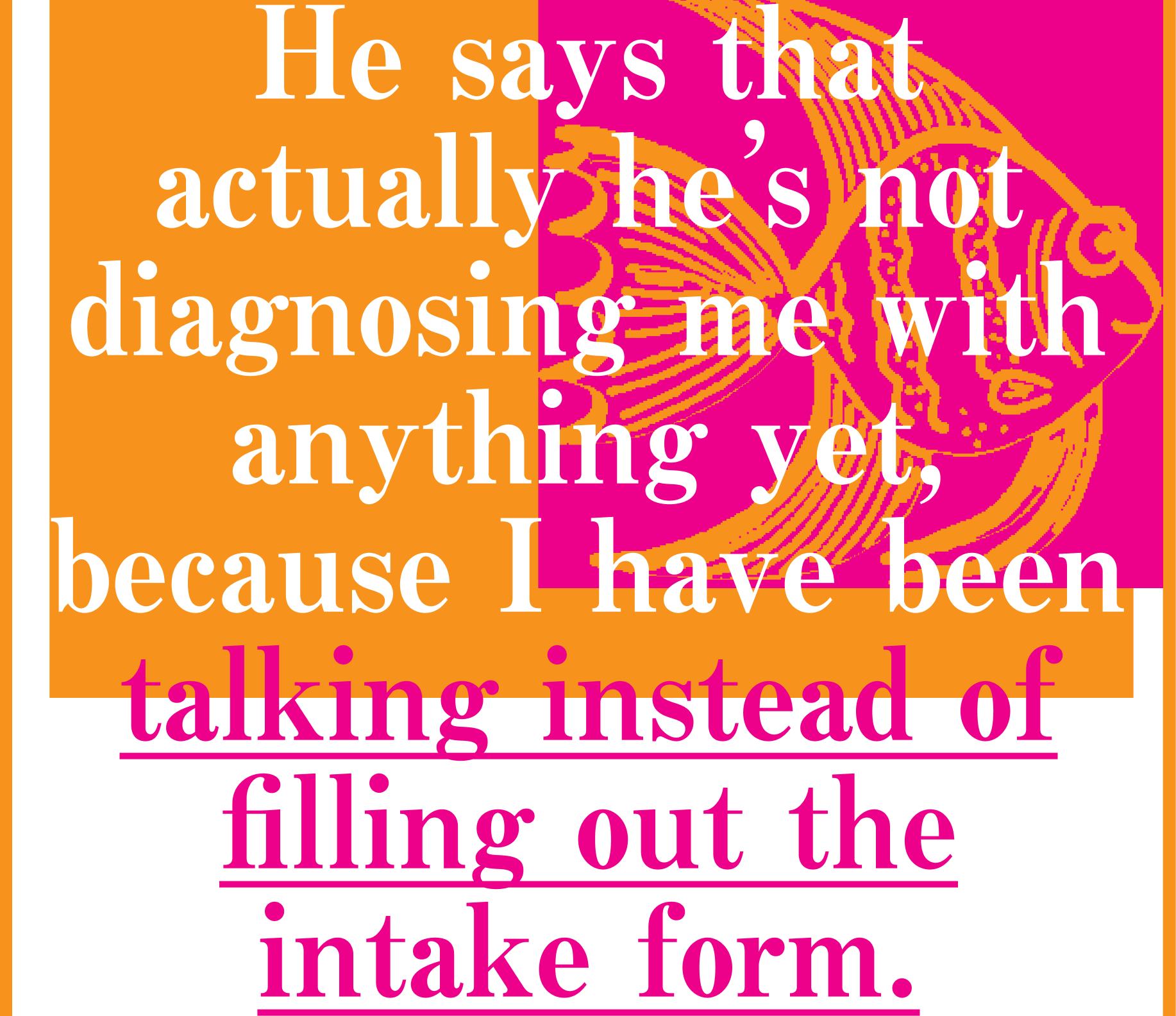 He gives me a few prescriptions for non-lithium pills and a list of targeted therapeutic treatment plans, which I lose immediately. I take a picture with my hospital bracelet and I tell myself for a while that I won’t tell a story about it, but that too, of course, was a story, which—like love, sex, or going on vacation—is a structure in which the truth must be betrayed again and again in the slouch towards something like meaning.