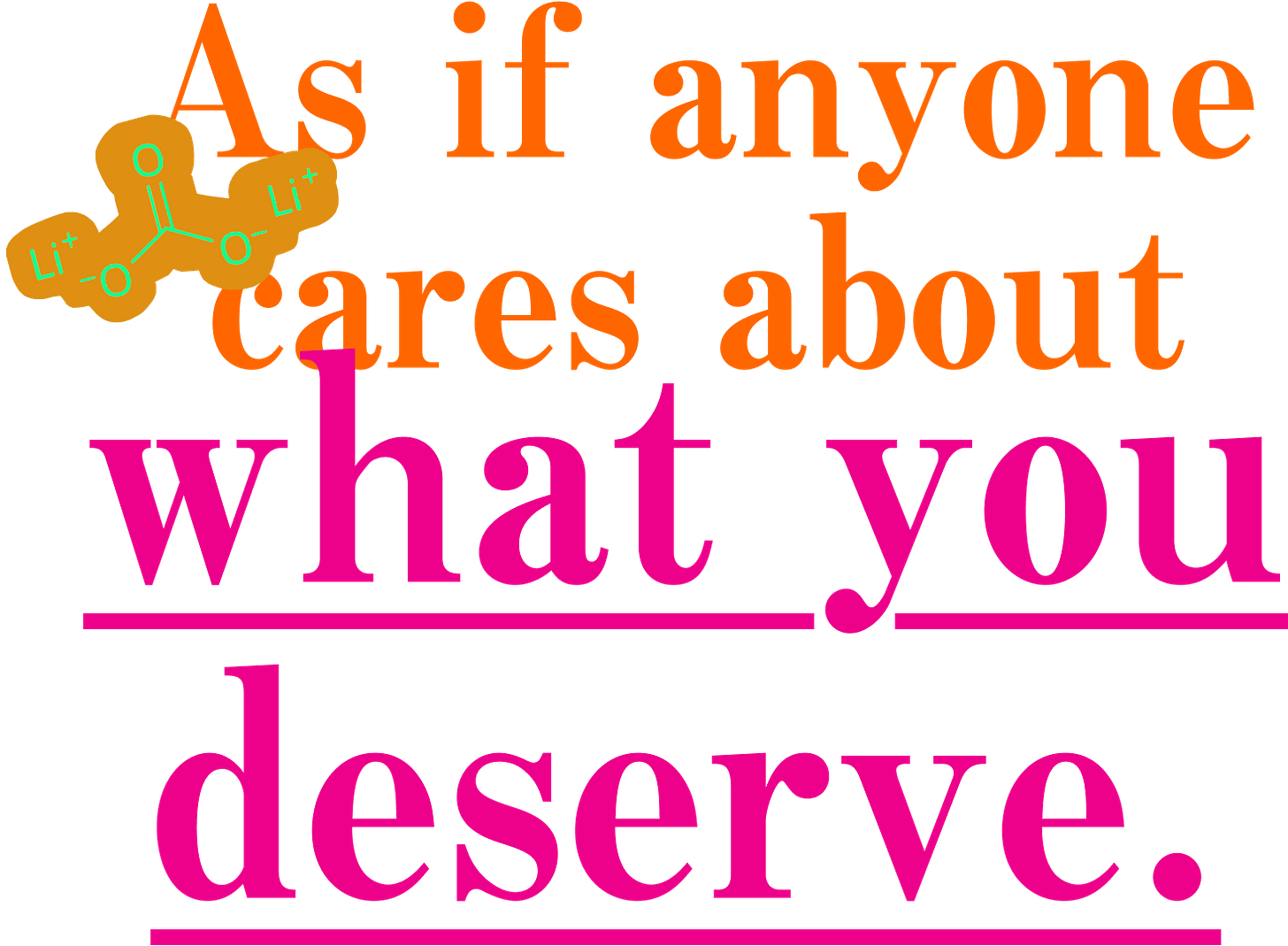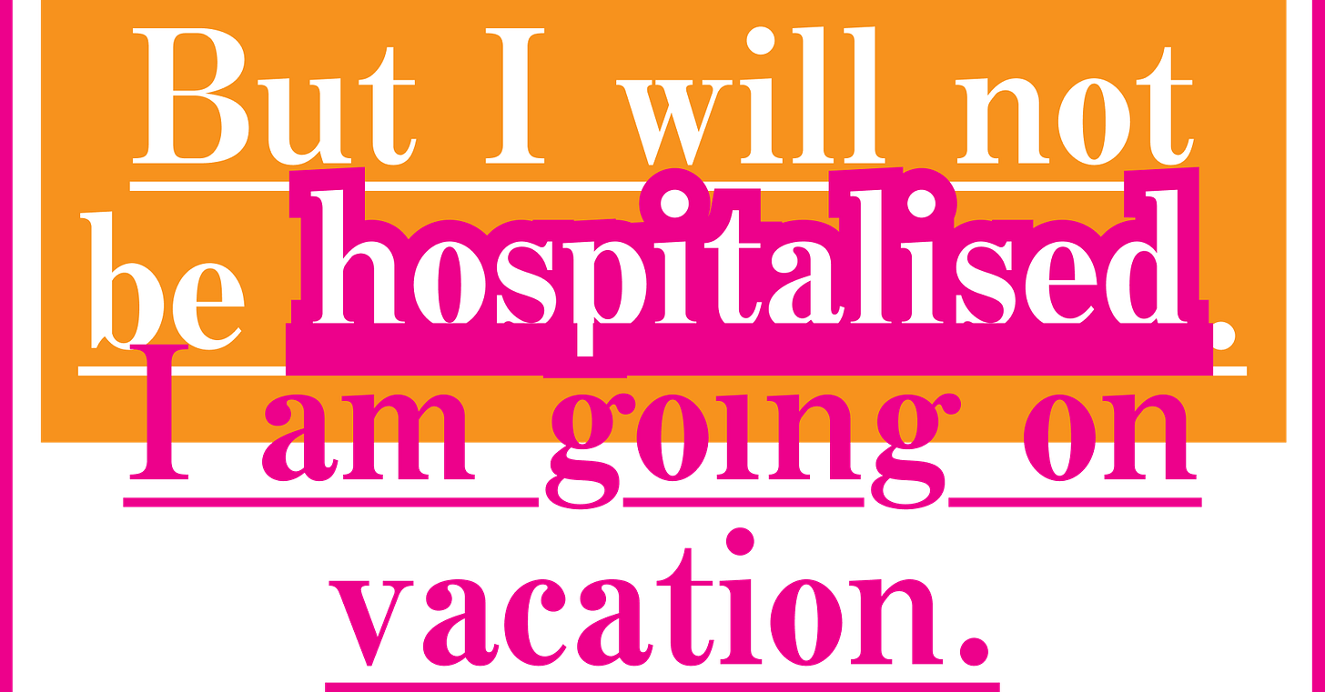 After I get back from vacation I am made to go to the hospital. My therapist tells me that the doctors might put me on lithium, which I thought was either made up or only existed for vacant housewives in the 1950s, but it turns out that it is real and it can also be for girls who think that everyone at their work party was trying to have sex with them. I ask the doctor if thinking that everyone wanted to have sex with me would still be considered a potential symptom of a delusional psychotic disorder if I were prettier. I say, “To be clear, I know I wasn’t ‘interfacing with reality’ at the work party, but I just think it’s interesting that no one even considered for a second that maybe everyone actually DID want to. I just mean, by diagnosing my sanity in this case you are also implicitly making a harsh and underinformed judgement on my sexual magnetism, and you should at least get to see me in action before you diagnose me with bipolar disorder or something, because many people actually find me quite charming, so it might not be so crazy after all.”