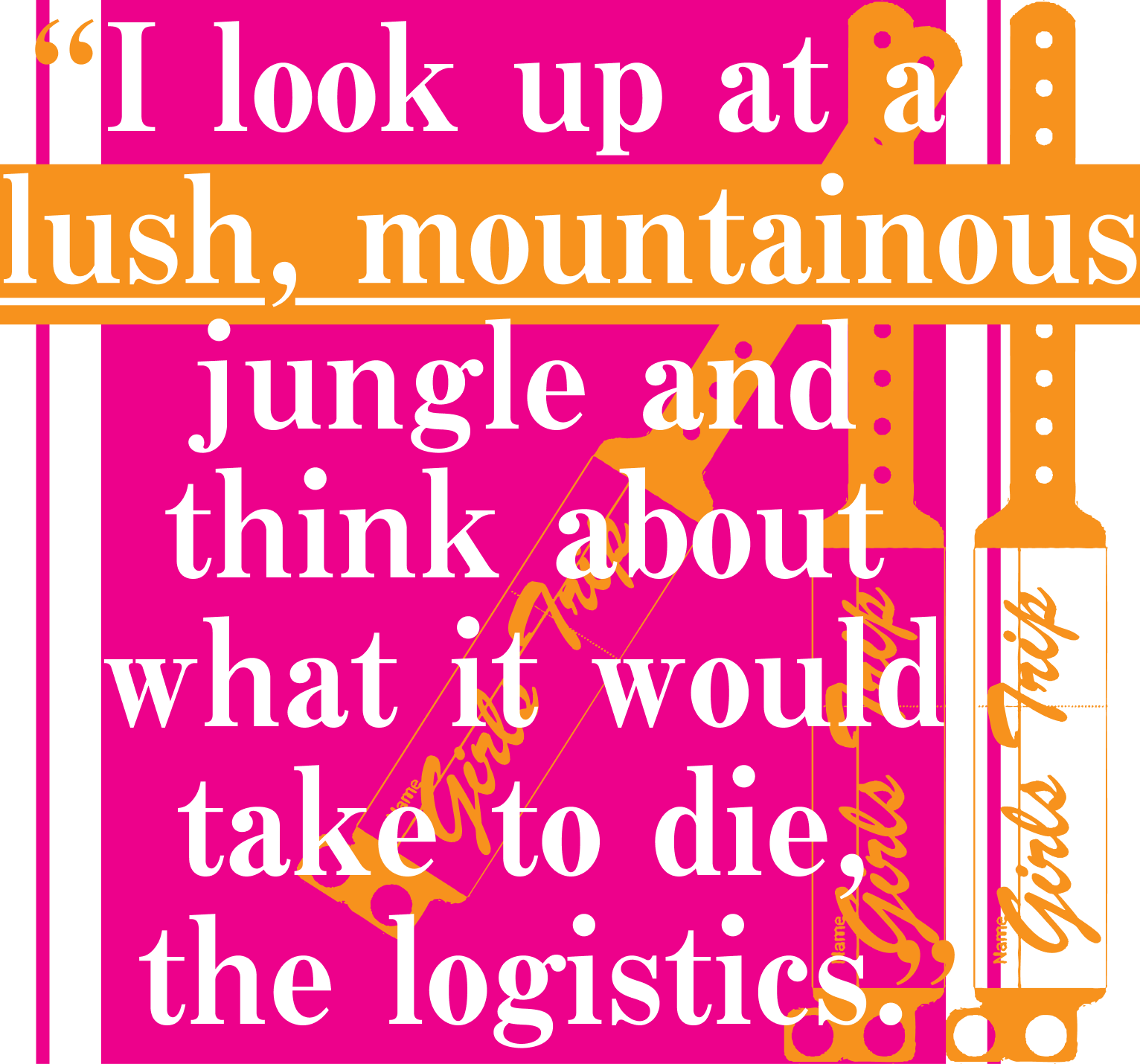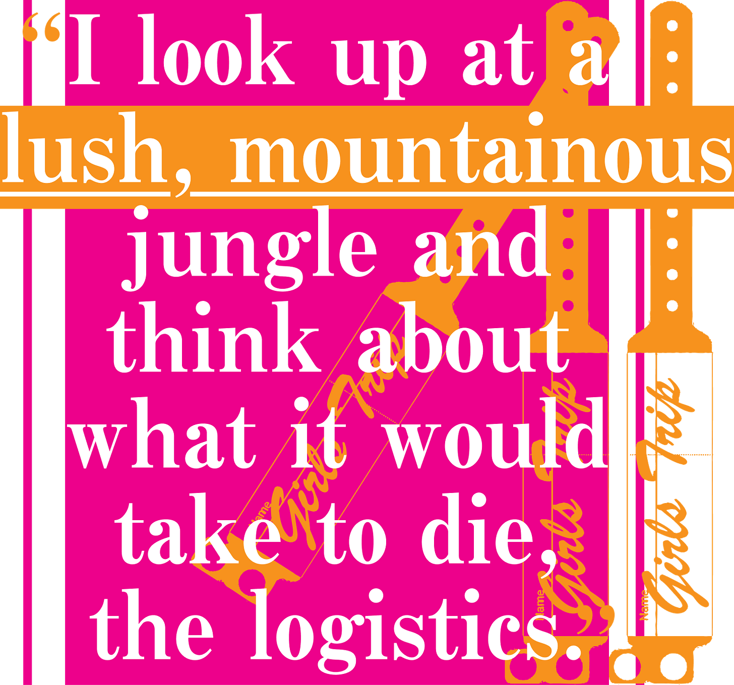 A week before I went on the girls’ trip that was supposed to change my life, I was talking to everyone at the party about killing myself. I don’t drink—at this party, whenever someone asked me why I wasn’t drinking, I said, as I often do, “It’s complicated”—but I kept spilling my drink on strangers, gesticulating wildly, tap water sloshing over the sides of my plastic cup onto the shirt sleeve of another writer/academic/editor/publisher whose name I couldn’t remember. “Oh, fuck, sorry—I’m not drunk—I actually don’t drink—it’s complicated—sorry, I haven’t been out of the house in a while, I’ve been thinking about killing myself, ha ha ha.” They loved it. They wanted to have sex with me. I was thinking that everyone at the party was wanting to have sex with me, which was a problem for them on account of the killing myself thing.