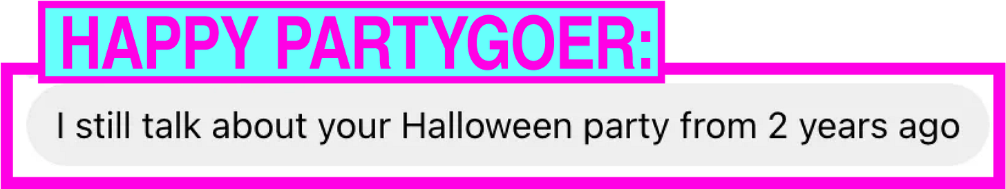 I am a Halloween Fanatic. I don’t care how White Girl Millenial Autumnal Cringe that makes me sound, Halloween is my favorite holiday!! I love it and I love dressing up! I throw a Halloween party every year and before that, my parents—who most resemble Gomez and Morticia Addams—would throw a Halloween party every year. Recent DM testimonial from a Happy Partygoer: