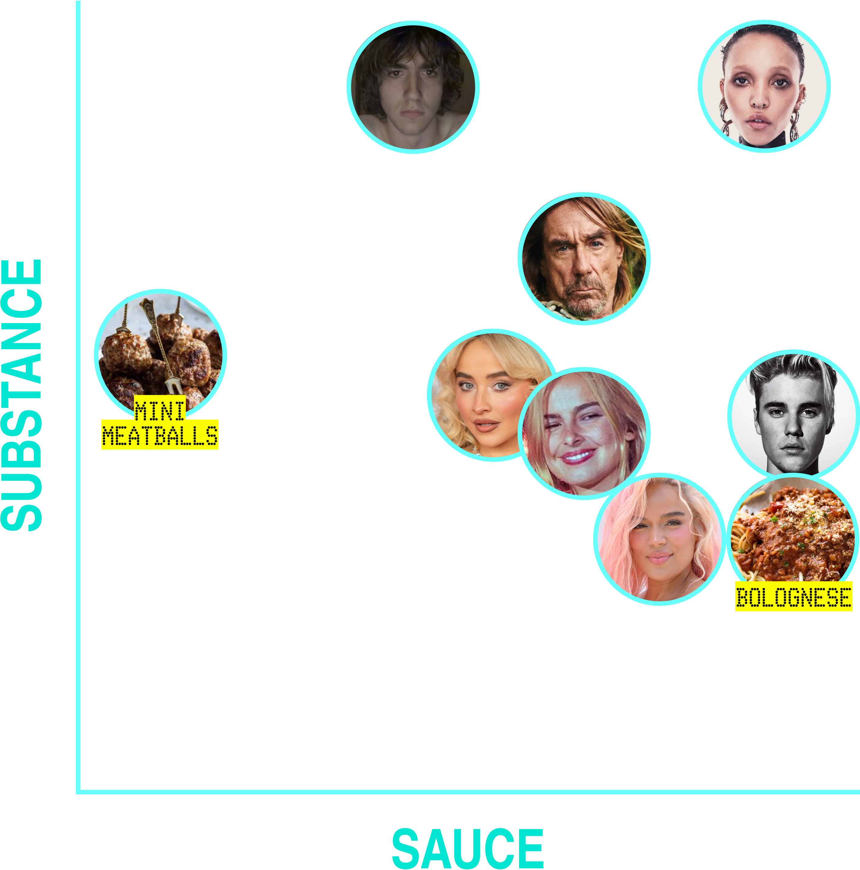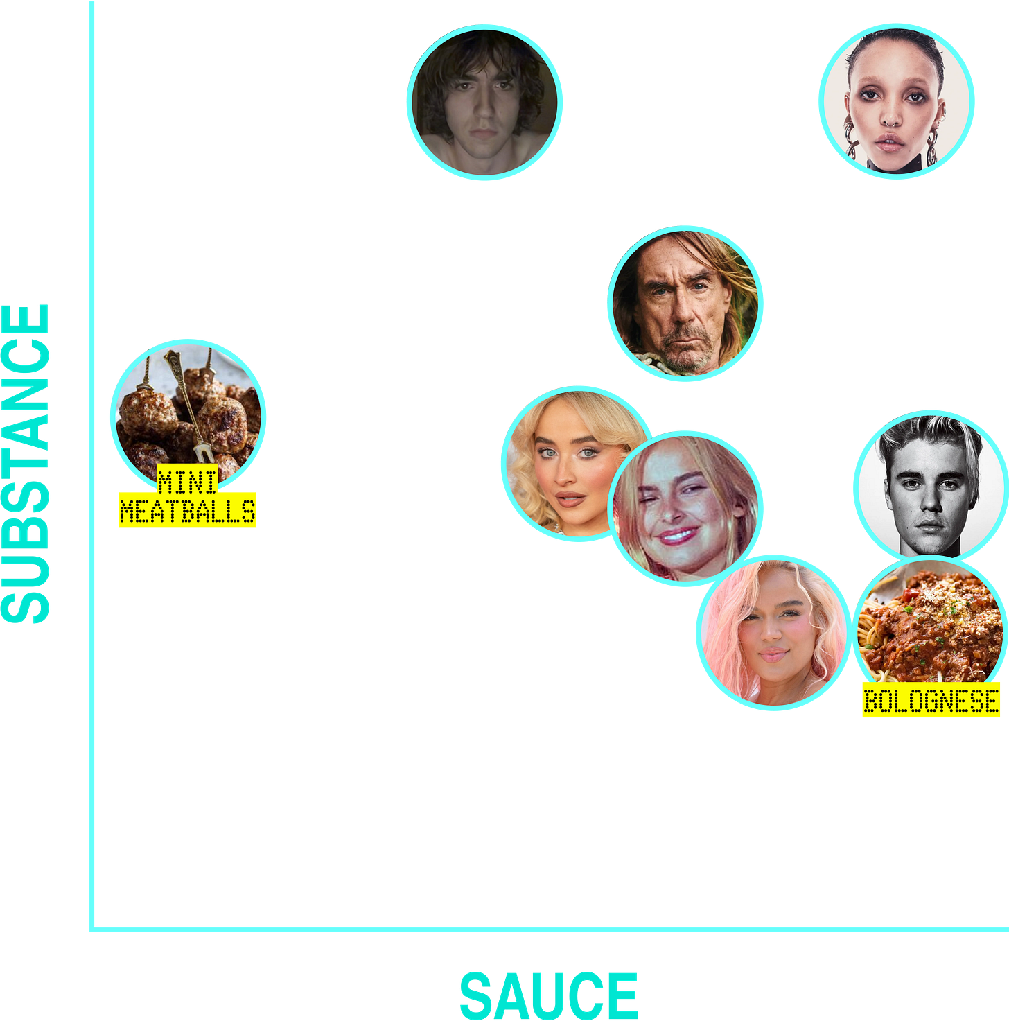 During my 2 a.m. Palm Springs to LAX car ride I made a sauciness/substance/meal metric. Basically, some musicians have the sauce (the swag/drip/style/je ne sais quoi), some have the substance (talent/prowess/creativity). If you have sauce and substance you could be a mini meatball, but you could also be a main course: