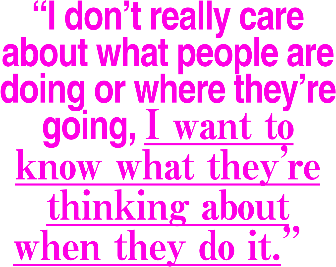 I’d so much rather see Lola Dement Myers pick up her dog tags from wherever she has them fabricated, inspect them, then read a list of ten cool spots in New York: I don’t really care about what people are doing or where they’re going, I want to know what they’re thinking about when they do it.